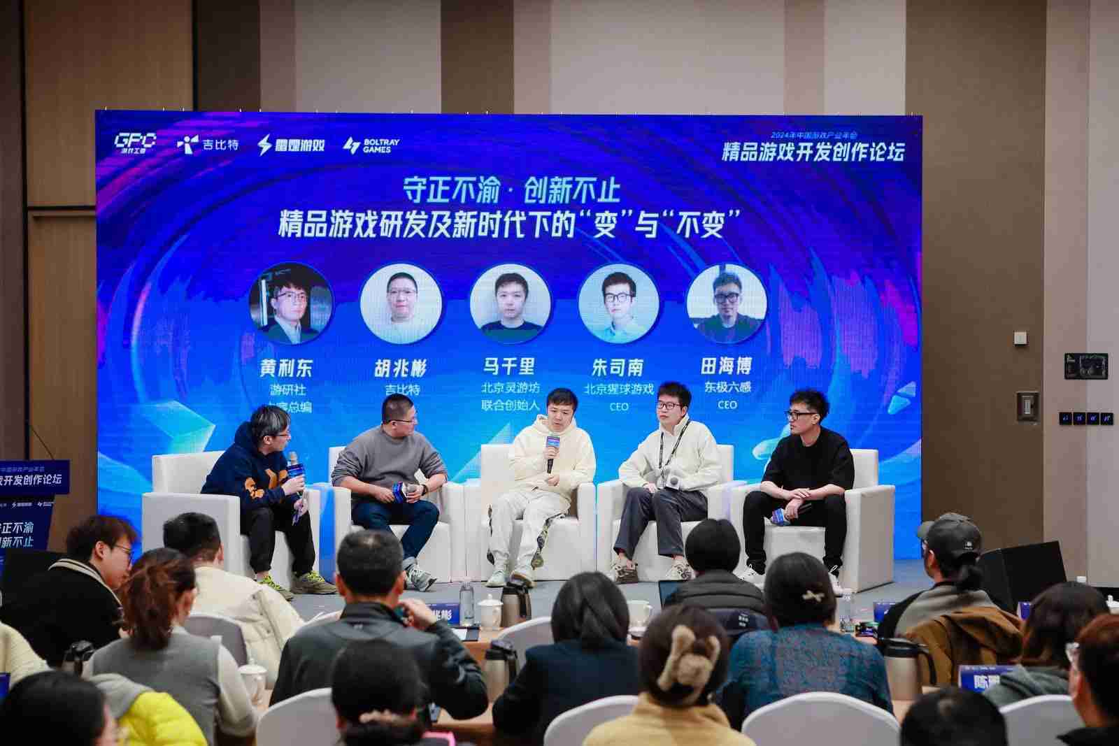 圆桌对话环节,,,在游研社内容总编黄利东的主持下,,,,918.comCTO胡兆彬、、北京灵游坊联合创始人马千里、、北京猩球游戏CEO朱司南、、、东极六感CEO田海博等四位嘉宾围绕“守正不渝、、、创新不止——精品游戏研发及新时代下的‘变’与‘不变’”这一主题分享了各自在精品游戏开发理念及工程能力搭建方面的见解和经历,,,并就行业变化下游戏人需要坚守的理念等展开交流探讨。。。